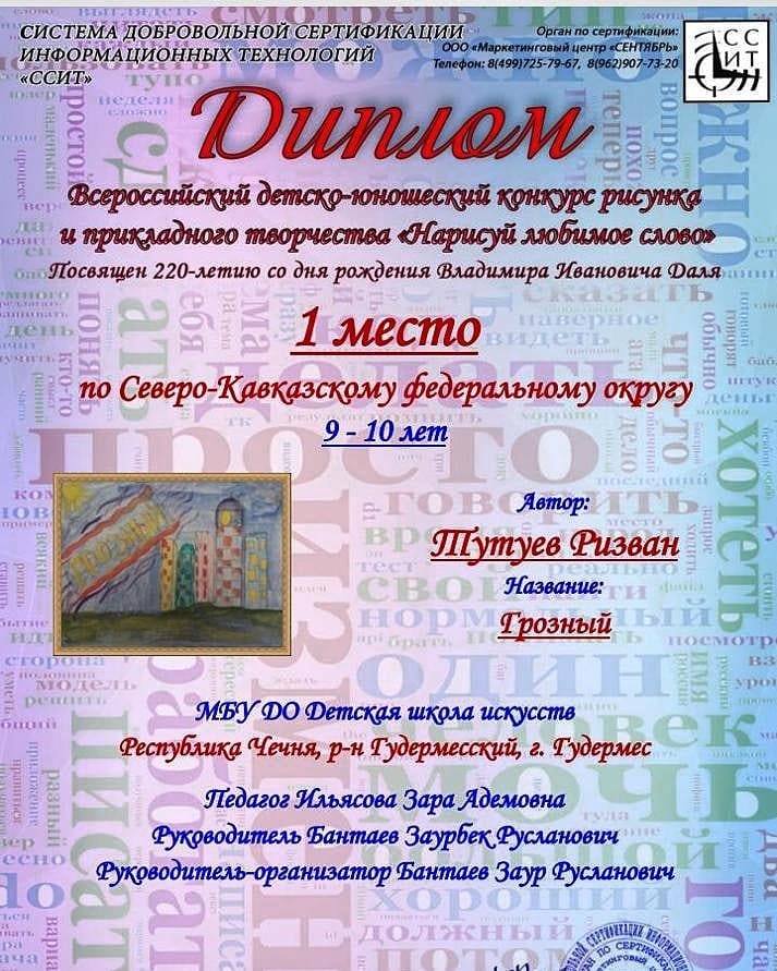 Ученик 5А класса, Тутуев Ризван занял 1-е место во Всероссийском детско-юношеском конкурсе рисунка и прикладного творчества "Нарисуй любимое слово".