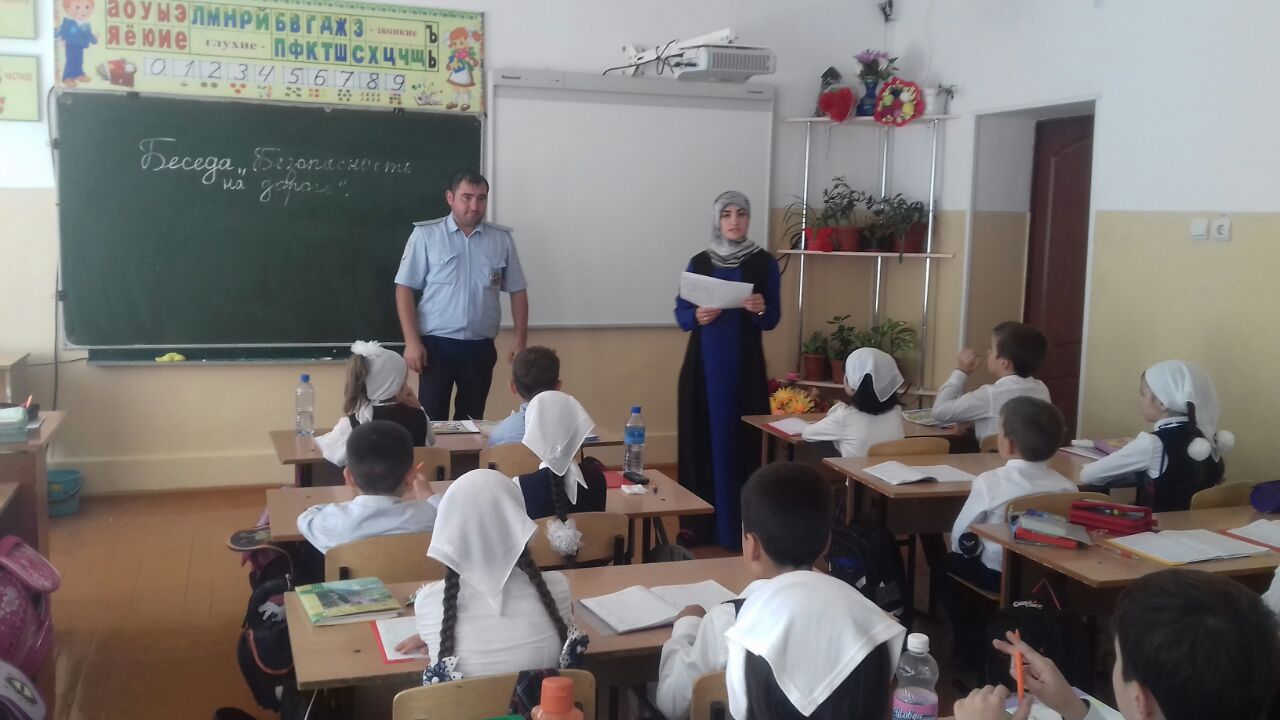 15.09.2017 г в МБОУ "Гудермесская СШ№3" состоялась встреча сотрудника ГИБДД старшего лейтенанта полиции Масаева Зелимхана Шамхановича, инспектора по пропаганде БДД, с учащимися 2 а класса. С детьми была проведена беседа "Безопасность на дороге". Учащиеся рассказали стихи, показывали рисунки, отвечали на вопросы викторины " Знатоки правил дорожного движения".