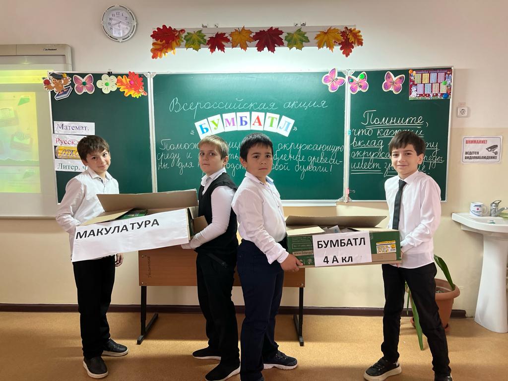14.11.2023В МБОУ "Гудермесская СШ №6" была успешно организована Всероссийская акция по сбору макулатуры "Бумбатл" в рамках реализации федерального проекта "Социальная активность" национального проекта "Экология". В акции приняли участие ученики 1-11 классов. Данное мероприятие имеет большое значение для нашего учебного заведения, поскольку позволяет детям осознать важность сохранения и охраны окружающей среды.